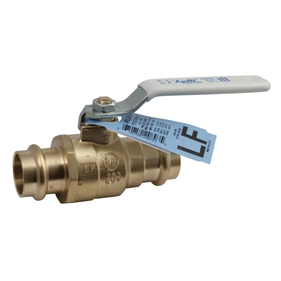 Apolloxpress® 2-Piece Full-Port Standard Ball Valve, Series/Model: Series 77VLF-140, Nominal Size: 1/2 IN, Connection Type: Press, Pressure Rating: 250 PSI, Temperature Rating: 0 - 250 DEG F, Brass Body Material, Lever Handle Operator Type, Handle Material: Steel, Stem Material: 316 Stainless Steel, Trim Material: 316 Stainless Steel Ball, Packing Material: RPTFE Stem, Brass Gland, Seat Material: RPTFE, Seal Material: EPDM, Material Standard: Ball And Stem: ASTM A276, Gland: ASTM B16, Material Specification: Body: UNS C27451, Finish/Color: Plated Handle, Industry Standards: MSS-SP-110 Compliant, NSF/ANSI 372 Lead Free, IAPMO IGC-157 Certified, Directive 2011/65/CE (RoHS), UL Listed, 2.89 IN Width, Lead Free: Yes, Other Physical Dimension: 1.66 IN Inlet Center To Top Of Handle, 2.85 IN Handle Length