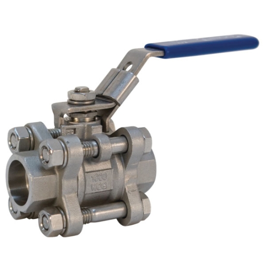 3-Piece Full-Port Ball Valve, Series/Model: Model K-595-S6-R-66-LL, Nominal Size: 1 IN, Connection Type: Socket Weld, Pressure Rating: 1000 PSI (CWP) Non-Shock, Temperature Rating: 400 DEG F, Stainless Steel Body Material, Locking Lever Handle Operator Type, Handle Material: 304 Stainless Steel, Stem Material: 316 Stainless Steel, Trim Material: 316 Stainless Steel Trim And Ball, Packing Material: Carbon Filled PTFE Stem, 316 Stainless Steel Packing Gland, Seat Material: Reinforced PTFE, Seal Material: Reinforced PTFE, Material Standard: Body: ASTM A351 Grade CF8M, Ball: ASTM A276/A351 Grade CF8M, Stem And Gland: ASTM A276, Industry Standards: MSS-SP-110 Compliant, 3.62 IN Width, Lead Free: No, Other Physical Dimension: 2.95 IN Inlet Center To Top Of Handle, 5.71 IN Handle Length