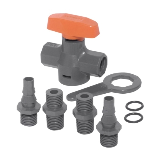 Universal Stopcock Valve Kit, Nominal Size: 1/4 IN, Ports/Ways: 2-Way, Pressure Rating: 15 PSI At 70 DEG F, PVC Body Material, Seal Material: EPDM, 2.1 IN Width, Lead Free: No, Other Physical Dimension: 1.51 IN Inlet Center To Top Of Valve, 1.78 IN Handle Length, Additional Specifications: Includes: FPT X FPT, FPT X Hose, FPT X MPT, Hose X Hose, MPT X Hose, MPT X MPT Connections