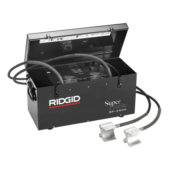 The RIDGID Model SF-2500 is a mini-refrigeration unit that circulates self-contained refrigerant to its aluminum freeze heads. Once the pipe is plugged, repairs can be made while the ice plug is maintained by the unit. Now includes a bottle of specially formulated freeze gel to speed freezing. Apply the gel to freeze heads before placing on pipe.