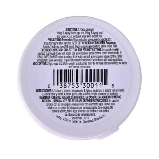 Oatey® No. 5 paste flux is a petrolatum-based flux designed to provide superior wetting properties for better solder flow. It can be used with most soft solders, 100% lead-free and safe for use on potable water applications. No. 5 paste flux's formula prevents copper piping turning green and is excellent for large diameter copper pipe applications. Oatey products have earned the trust of plumbing professionals for over 100 YR.