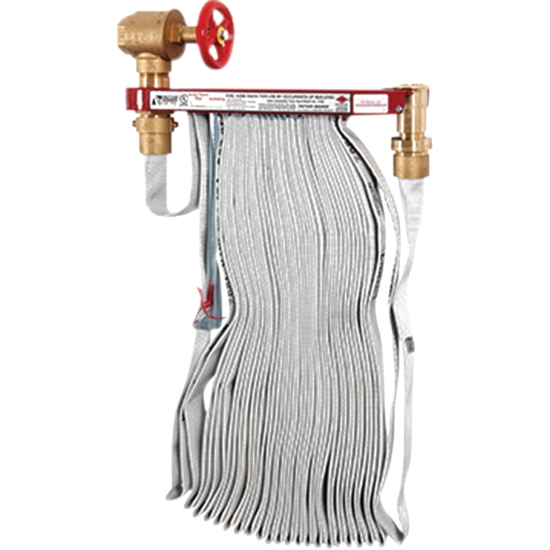 This 1.5 IN fire hose rack assembly is intended for class II service. It is used to provide an immediate and more efficient means of fire control. The assembly is capable of one-person operation and meets the nationally recognized standard 100 GPM (378.5 LPM) at 65 PSI (4.5 BAR) at the outlet of the valve. Includes 1.5 IN escutcheon set and brass pin lug coupling line 500 LB. Polyflex hose for interior standpipe U/L satin brass fog nozzle and red polyester coated steel U/L and hose rack with instructional decal.