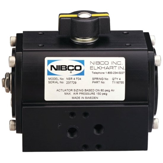 The Nibco® series NDA/NSR pneumatic actuator features a patented spring design and a durable anodized extruded aluminum body. They are specifically designed for quarter-turn applications, including ball valves, butterfly valves, dampers and plug valves. Nibco® pneumatic actuators are manufactured in a wide range of output torques to fit the characteristics of the valve application. They are designed for either on-off duty, modulation or proportional control in industries ranging from chemical processing and pulp and paper, to petroleum refining, production industries, marine applications, and commercial construction applications. Nibco® series NDA/NSR pneumatic actuators offer exceptional starting and ending torque in a compact design. They consistently meet the demand for high torque, even in applications where the valve has been closed for an extended period. Engineered for a long, lubrication-free service life, NDA/NSR actuators combine o-ring and PTFE seals to create a durable, low-friction seal. Pneumatic accessories include three and four way solenoids, switch box with limit switches and beacon, positioners for air or electric signal throttling service and speed controls. Please refer to Nibco® technical data sheets, valve selection guides and catalog for engineering and installation information.