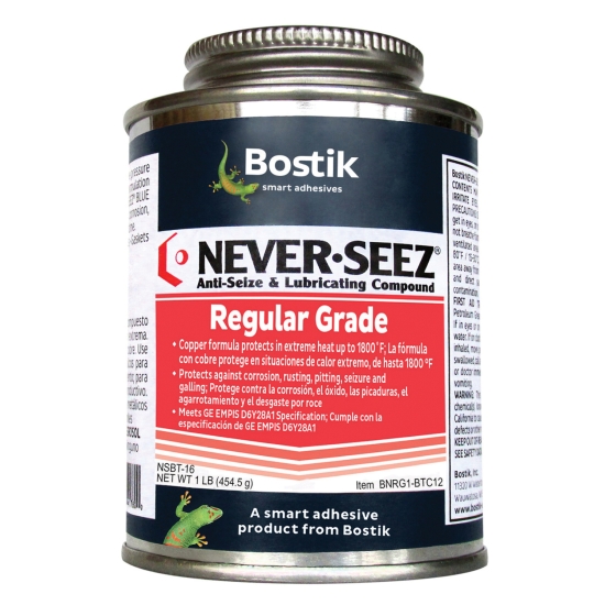 Never Seez NSBT-16 is an extreme pressure lubricant and anti-seize compound recommended for the protection of metal parts against rust, corrosion and seizure. NSBT-16 regular grade anti-seize contains a high-quality bearing grease with graphite, copper flake, aluminum powder and zinc oxide to protect parts even in high heat, high pressure and corrosive environments. With an operating temperature range spanning -297 to 1800 DEG F, this extreme pressure lubricant prevents galling on steel to stainless steel, titanium, magnesium and other hard metals. Use on nuts, bolts, screws, pipe fittings, chain drives, machinery, gaskets, valve assemblies, shafts, taps and drills to keep parts working longer with less wear. NSBT-16 protects against carbon fusion and minimizes parts replacement costs. Excellent in water, salt water and ionized water, Never Seez regular grade anti-seize will not deteriorate with age when stored unopened at temperatures below 120 DEG F.