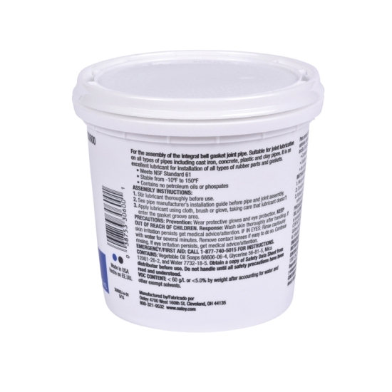 Oatey® all-purpose pipe lubricant is a non-toxic, soft, paste-like material used for assembling pipelines, including cast iron, concrete, plastic and clay pipe. It adheres to wet and dry surfaces and will not deteriorate natural or synthetic rubber. Oatey products have earned the trust of plumbing professionals for over 100 YR.