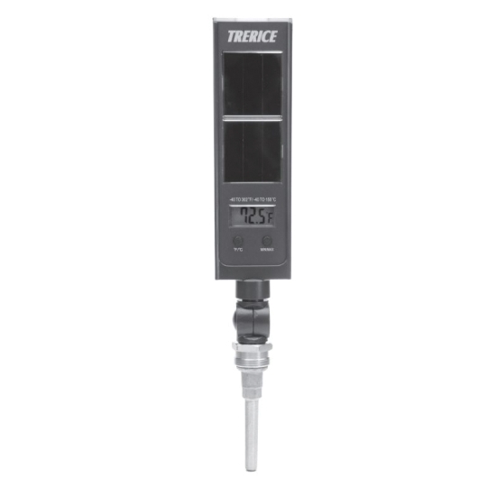 The Trerice SX9 "Solar Therm" now comes standard with a NEMA-4X case, making it the perfect choice for outdoor applications and in areas that require "spray-down". Our industry first "Capsule-Tite" sealing technology insures that the electronics stay dry no matter what the application. The SX9 is the ideal replacement for existing mercury-in glass thermometers in environmentally conscious applications. It features a rugged cast aluminum case, easy to read LCD display and an adjustable-angle stem that is fully interchangeable with industrial liquid-in glass thermometers. Also available is a bimetal type stem for applications where a digital thermometer is preferred over existing analog bimetals. The "Solar Therm" requires no external power and needs only 10 lux of illumination (from any light source) to operate. The unique min/max feature provides instant recall of minimum and maximum temperatures over a given period and is easily reset.