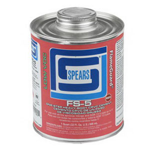 Heavy Body 1-Step Blended CPVC Cement, Series/Model: Series FS-5, Size: 16 OZ, Container Type: Can, Red Color, Form: Heavy Syrupy Liquid, Odor: Ether-Like, Specific Gravity: 0.985 Plus/Minus 0.04, Flash Point: -20 DEG C, VOC: 490 G/L, Industry Standards: UL Listed, FM Approved, NSF/ANSI Standards 14/61 for PW, DWV, SW, UPC Listed, Meets SCAQMD Rule 1168/316A For Compliance With LEED®, ASTM F493 Compliant, Additional Specifications: Viscosity: 1600 CP Minimum, Shelf Life: 2 YR, Boiling Point: 66 DEG C, Freezing Point: -108.5 DEG C