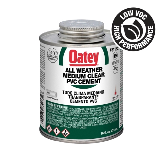 Oatey® PVC all weather medium bodied fast set clear cement is recommended for potable water, drain, waste and vent applications. It is formulated to perform in all weather conditions from -15 to 110 DEG F and applies easily with included in-lid dauber. This clear, medium bodied, fast set cement can be used to solvent weld all schedules and classes of PVC pipe and fittings up to 6 IN diameter with interference fit. Oatey products have earned the trust of plumbing professionals for over 100 YR.