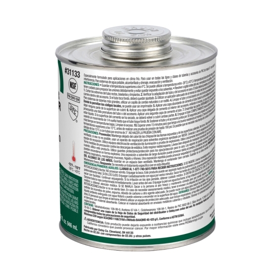 Medium Body All Weather PVC Cement, Size: 32 OZ, Container Type: Can, Clear Color, Form: Translucent Liquid, Odor: Solvent, Dry Time: 1 - 2 MIN At 70 - 90 DEG F, Temperature Rating: -15 To 110 DEG F, Specific Gravity: 0.95 Plus/Minus 0.02, Flash Point: -4 DEG F, VOC: 510 G/L, Industry Standards: NSF Standard 61 For PW, DWV And Sewer Waste, UPC IAPMO Certified, Meets California South Coast Air Quality Management District SCAQMD 1168/316A Or BAAQMD Method 40, Meets ASTM D-2564, Additional Specifications: Viscosity: 500 CP Minimum, Shelf Life: 3 YR, Boiling Point: 151 DEG F