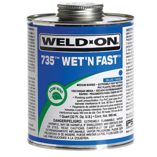 Wet 'N Fast™ PVC Cement, Series/Model: Series 735, Size: 16 OZ, Container Type: Can, Blue Color, Form: Medium Syrupy Liquid, Odor: Ketone, Specific Gravity: 0.955 Plus/Minus 0.04, Flash Point: -20 DEG C, VOC: Less Than 510 G/L, Industry Standards: NSF/ANSI 14, 61, Listed By IAPMO ASTM D 2564, PW/DWV/SW, Meets SCAQMD Rule 1168/316A, UPC Listed, Additional Specifications: Viscosity: 500 CP Minimum, Shelf Life: 3 YR, Boiling Point: 56 DEG C