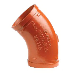 Long Radius 45 DEG Elbow, Series/Model: Model 110, Nominal Size: 2 IN, Connection Type: Grooved End, Material: Ductile Iron, Material Standard: ASTM A536 Grade 65-45-12, Finish/Color: Orange Enamel Painted, Outside Diameter: 2-3/8 IN, Maximum Pressure: 1000 PSI, Industry Standards: C/US UL Listed, FM, LPCB, CTP Approved, Other Physical Dimension: 2-3/4 IN Center To End, Domestic/Import: Import