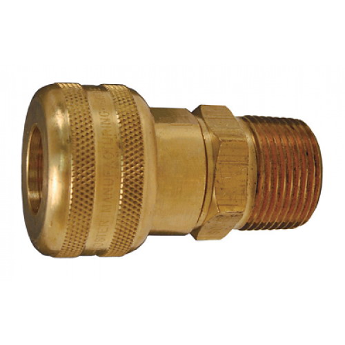 Semi-Auto Industrial Air Chief Quick Disconnect Coupler, Nominal Size: 1/4 IN, Thread Size: 3/8-18, Connection Type: MNPT, Material: Brass, Pressure Rating: 300 PSI, Temperature Rating: -40 To 250 DEG F, Outside Diameter: 0.88 IN, Length: 2.08 IN, Industry Standards: Military Specification MIL-C-4109F/A-A-59439, Other Physical Dimension: 3/4 IN Hex, Additional Specifications: Flow Rate: 37 CFM At 100 PSI