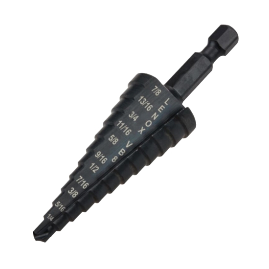 Vari-Bit® Step Drill Bit, 13 Drill Stages, 1/8 IN Minimum Drill Diameter, 1/2 IN Maximum Drill Diameter, 2 Flutes, 1/4 IN Shank Diameter, Material: High Speed Steel, Finish/Color: Steam Oxide Coated, Additional Specifications: Packaging: 1/Pack