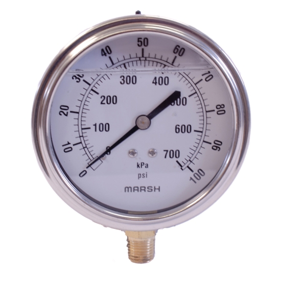 Marsh Instruments severe service liquid filled gauges are designed to perform in rugged and harsh environmental conditions, especially where pulsation or vibration is present. Liquid filled gauges offer a significant cushioning and dampening effect, reducing pointer flutter and lubricating the internals.