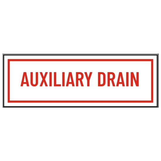 Identification Sign, Legend: AUXILIARY DRAIN, Material: 0.02 IN Aluminum With Removable Plastic Coating, Red Legend, White Background, Length: 6 IN, 2 IN Width, Industry Standards: Meets NFPA 13 Requirements