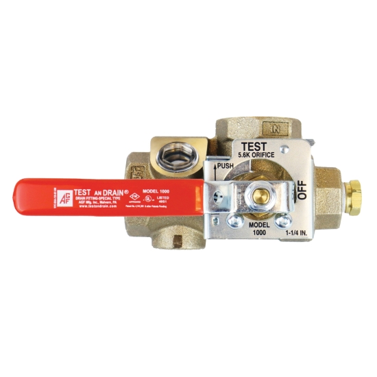 Lightweight and compact, AGF's model 1000 TESTanDRAIN is a 300 PSI rated single-handle ball valve that was specifically designed to provide both the test function and the express drain function required by NFPA 25 for a wet fire sprinkler system. In 1986, the model 1000 revolutionized the industry and replaced the entire floor control loop assembly in one valve. The compact single-handle ball valve is rated to 300 PSI, includes tamper-resistant test orifice and sight glass. Made in USA. UL listed and FM approved. Thread x Thread connection.