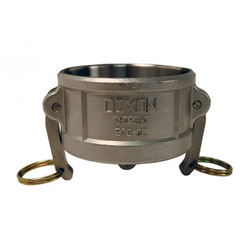 Type DC Dust Cap, Nominal Size: 5 IN, Material: 316 Stainless Steel, Outside Diameter: 6-1/2 IN, Length: 3-3/8 IN, Other Physical Dimension: 2-7/16 IN Coupler Length, 7-9/16 IN Distance Across Closed Cam Arms, 12-3/16 IN Distance Across Open Cam Arms