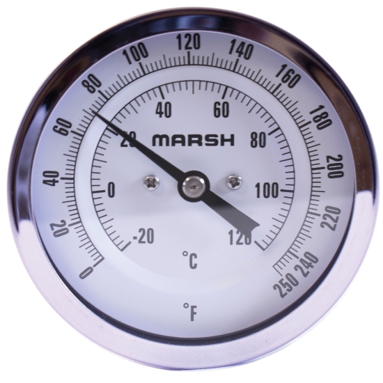 Marsh Instruments bi-metal thermometers are heavy-duty instruments for temperature indication in dual scale ranges from -50 to 1000 DEG F (-40 to 525 DEG C). Series "L" bi-metal thermometers include an easy-to-read dual scale, fast response, and accurate temperature indication. The hermetically sealed case is resistant to shock, vibration, dust, and moisture. The bi-metal sensing element provides an accuracy to within 1% of scale. An external adjustment screw on the back of the case provides convenient reset and field calibration. Built-in over-range protection is a standard feature.