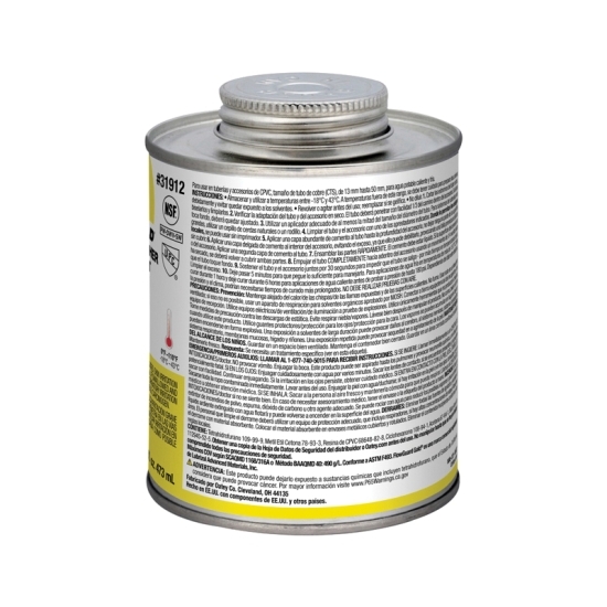FlowGuard Gold® All Weather 1-Step CPVC Cement, Size: 16 OZ, Container Type: Can, Yellow Color, Form: Translucent Liquid, Odor: Solvent, Dry Time: 1 - 2 MIN At 70 - 90 DEG F, Temperature Rating: 0 - 110 DEG F, Specific Gravity: 0.94 Plus/Minus 0.02, Flash Point: 14 - 23 DEG F, VOC: 490 G/L, Industry Standards: NSF Standard 61 For PW, DWV, SEWER, UPC IAPMO Certified, Meets California South Coast Air Quality Management District SCAQMD 1168/316A Or BAAQMD Method 40, Meets ASTM F-493, Additional Specifications: Viscosity: 500 CP Minimum, Shelf Life: 2 YR, Boiling Point: 151 DEG F