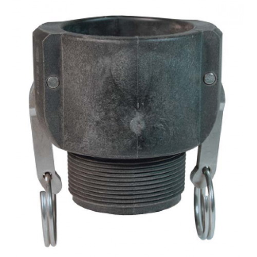 Type B Coupler, Nominal Size: 2 IN, Connection Type: Female X MNPT, Material: Glass-Filled Polypropylene, Maximum Pressure: 100 PSI, Length: 3-1/2 IN, Other Physical Dimension: 2-1/4 IN Coupler Length, 3-5/8 IN Distance Across Closed Cam Arms, 7-5/8 IN Distance Across Open Cam Arms