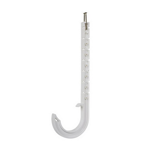 Hangs Tuff™ STYLE DWV J-Hook, Series/Model: Series 553, Nominal Size: 1-1/2 IN, Maximum Load: 40 LB Cradle, 15 LB Inverted, Material: ABS, Finish/Color: White, Length: 10 IN, Temperature Rating: 140 DEG F, Industry Standards: UPC Listed, Other Physical Dimension: 8-5/8 IN Length To Center Of Pipe, 7-1/2 IN Length To Gripping Finger, 1 IN Distance Between Nailways