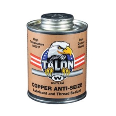 TALON copper anti-seize lubricant and thread sealant is a lead-free, non-seizing, copper based, lubricant and thread sealant. A premium quality copper anti-seize and thread lubricant that may be used to prevent seizing, corrosion and galling where high temperature conditions exist. Contains a high percentage of micro-fine copper flakes in a semi-synthetic grease carrier and is fortified with high quality rust and corrosion inhibitors. Temperature range: -0 DEG F (-17 DEG C) to 1800 DEG F (982 DEG C). Provides good electrical conductivity. Meets and exceeds MIL-A-907E Specification. TALON copper anti-seize can be used as a sealant and anti-seize lubricant for all metal pipe threads, bearings, drill collars, gear reducers, tool joints, rotary shoulder connections, screws, flange connections, couplings, seals, studs, bolts, plugs, pins, bushings, valve seats, valve stems, valve packing assemblies, valve gate assemblies, slides and key ways. Excellent for use on high pressure corrosive systems. TALON copper anti-seize will not bleed, separate, or settle. Prevents pressure leakage and seizing resulting from high temperature, freezing, heavy loads, corrosion, and vibration. Contains no grit. Prevents rust and corrosion. Specially formulated for summer or winter use. Provides easy assembly and disassembly of bolts, plugs, studs, flanges, and fittings.