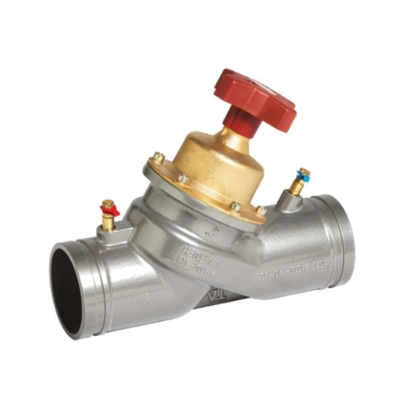 TA Manual Circuit Balancing Valve, Series/Model: Series 789, Nominal Size: 2-1/2 IN, Connection Type: Grooved End, Pressure Rating: 350 PSI, Flow Rate: 38 - 100 GPM, Temperature Rating: -4 To 250 DEG F, Ductile Iron Body Material, Handwheel Operator Type, Handle Material: Red Polyamide Plastic, Stem Material: Ametal, Seat Material: Ductile Iron, Seal Material: EPDM, Material Standard: Body: ASTM A536 Grade 60-40-18 (BS Grade 400/15), Finish/Color: Epoxy Resin Coated, 11.38 IN Width, Lead Free: No, Other Physical Dimension: 2-7/8 IN Actual Outside Diameter, 8 IN Inlet Center To Top Of Valve