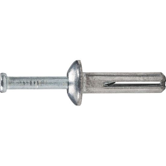 The Zamac Nailin is a nail drive anchor which has a body formed from Zamac alloy. Drive nails are available in carbon or stainless steel. The anchor can be used in concrete, block, brick or stone. A corrosion-resistant Zamac alloy is used to form the anchor body with either a mushroom or flat head. The anchor can be used for light duty, tamperproof applications. The anchor is not recommend for overhead, life-safety or sustained tensile loading applications (see performance data section).