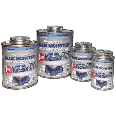 Blue Monster 1-step PVC cement is a self-priming PVC pipe glue that requires no additional primer. Blue Monster's 1-step joining process simplifies installations by reducing labor and offers faster curing times before pressure testing. Ideal for under-the-sink jobs and home remodels, Blue Monster 1-step PVC cement can be used on all classes of rigid and flexible PVC pressure pipe, including schedule 80, up to 6 in in diameter, and 8 in diameter on non pressure rigid and flexible PVC pipe. Blue Monster 1-step PVC cement is made with the highest-quality materials and meets or exceeds ASTM spec. D2564. Typical uses include potable water, pressure pipe, pool, irrigation, conduit, DWV, drain duct and sewer.