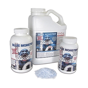 Blue Monster non-acid drain banger devours hair, grease, soap and oils that slow and plug drain lines in less than 60 seconds. This professional-strength drain opener is powerful and fast acting. Drain Banger's unique formula is embedded in blue flakes that work more effectively than liquid drain openers or beads. It is highly concentrated and when used as directed, will not cause rock-like masses, commonly referred to as "caustic clogs" that other forms of this type of product can cause. Contains no acid. Blue Monster Drain Banger is a hot water activated drain cleaner designed to be used by professional contractors only. It is odorless and will not harm plumbing fixtures, porcelain or septic systems.