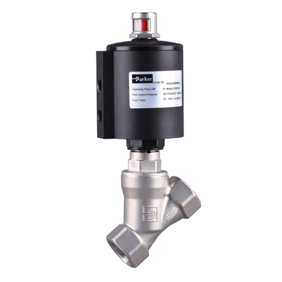 Parker 2-way, angle seat valves, normally closed and normally open, can handle a variety of media from air, inert gasses, water, steam, and corrosive solutions up to temperatures of 356 DEG F. They have durable 304 or 316L stainless steel bodies with aluminum or stainless steel actuator housing options, offer over seat or under seat configurations for all flow applications, and are compliant with Pressure Equipment Directive 97/23/EC.