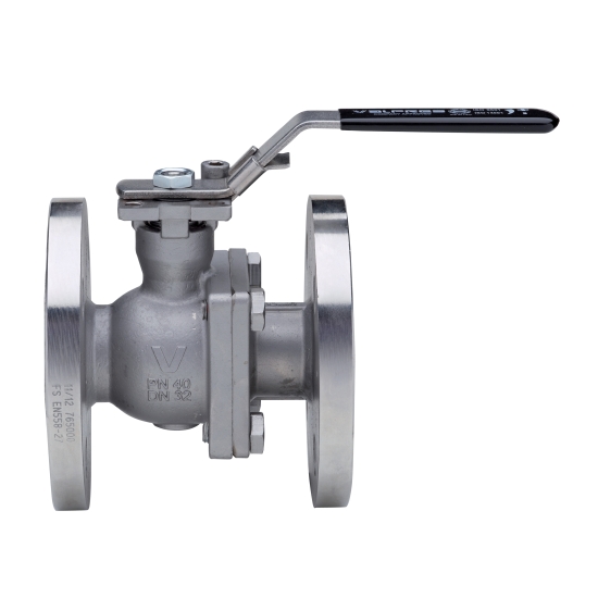 Stainless steel, ANSI class 150 flanged ball valve, full port, with locking handle.