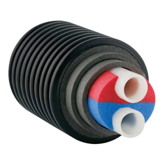 Ecoflex® thermal twin pipes are designed for fluid transfer in heating and cooling applications. The Wirsbo hePEX™ service pipes in Ecoflex® thermal twin piping are manufactured by the engel-method (PEX-a) process and are listed to ASTM F876 and F877. An oxygen-diffusion barrier extruded onto the service pipe dramatically reduces the amount of oxygen molecules that can migrate through the tubing wall. This oxygen-diffusion barrier protects ferrous components within the fluid pathway from corrosion. The pipe is surrounded by multi-layer, closed-cell, PEX-foam insulation and a water-resistant, corrugated HDPE jacket, making it ideal for direct-burial applications.