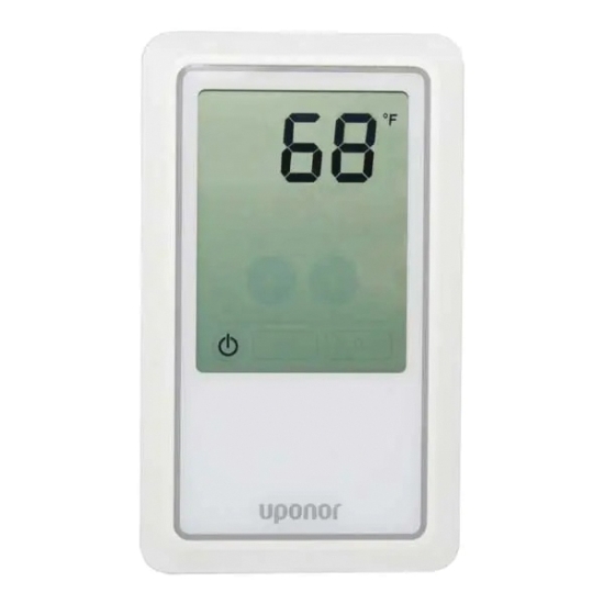 The Uponor heat only thermostat with touchscreen (A3100101) is a simple, non-programmable thermostat designed to sense room air temperature using operative temperature and or floor temperature via an optional floor sensor (A9010599).