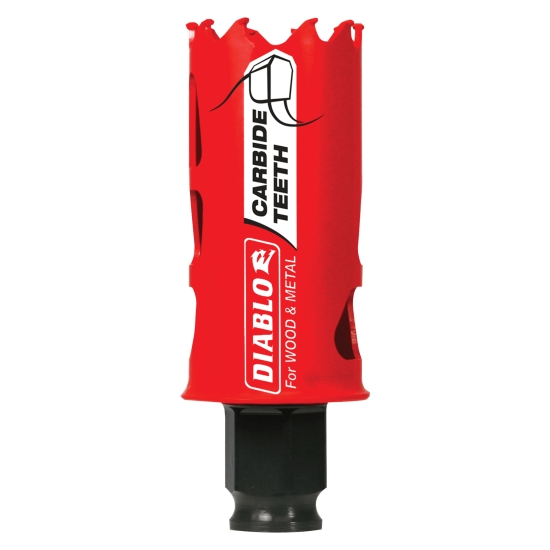 DIABLO® introduces carbide teeth hole saws, the first hole saws on the market to cut both wood and metal (wood, nail embedded wood, plastic, aluminum, metal, cast iron, stainless steel and metal). Delivering up to 50X longer cutting life than bi-metal, these new carbide teeth hole saws offer faster cutting performance and increased productivity.