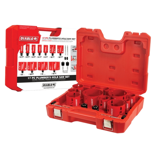 The DIABLO® 17-piece hole saw set for plumbers features (11) bi-metal hole saw cups, (2) Snap-Lock Plus™ system, (2) pilot bits and (2) adapter nuts (1/2 IN and 5/8 IN) for quick and easy hole saw cup changes for maximum job performance. This new, high performance hole saw set delivers faster cutting performance and increased productivity versus standard bi-metal hole saws. Unlike anything on the market, DIABLO® hole saws and Snap-Lock Plus™ mandrel system simplify the attachment process for fast and efficient hole saw mounting.