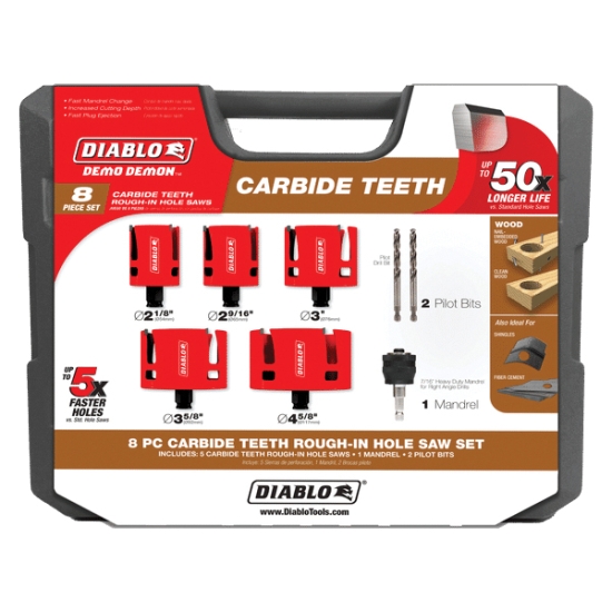 Demo Demon™ Rough-In Hole Saw Set, Carbide, Additional Specifications: Includes: (1) DIABLO® 2-1/8 IN Demo Demon™ Carbide Teeth Rough-In Hole Saw (DHS2125CTR), (1) DIABLO® 2-9/16 IN Demo Demon™ Carbide Teeth Rough-In Hole Saw (DHS2563CTR), (1) DIABLO® 3 IN Demo Demon™ Carbide Teeth Rough-In Hole Saw (DHS3000CTR), (1) DIABLO® 3-5/8 IN Demo Demon™ Carbide Teeth Rough-In Hole Saw (DHS3625CTR), (1) DIABLO® 4-5/8 IN Demo Demon™ Carbide Teeth Rough-In Hole Saw (DHS4625CTR), (2) Pilot Bits, (1) Mandrel