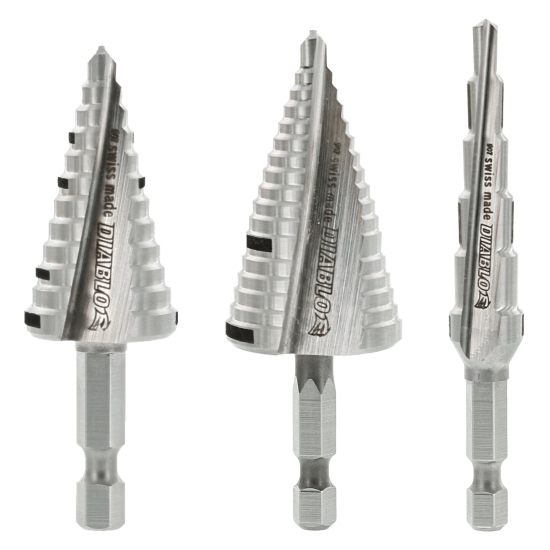 DIABLO® impact step drill bits bring exclusive technology to the electrician, plumber and HVAC contractor with fast, accurate cuts and increased stability in thin metals, PVC other plastic materials. The innovative split point tip design enables a fast, on point start resulting in increased durability and up to 6X longer life. DIABLO® Impact Strong™ step bits are impact ready and compatible with drills and impact drivers. An automated precision grinding process on each step reduces wear and delivers up to 2X faster cuts. Multiple hole sizes are made easy with laser etched step markings while increased step heights for common hole sizes makes drilling holes more efficient and faster.