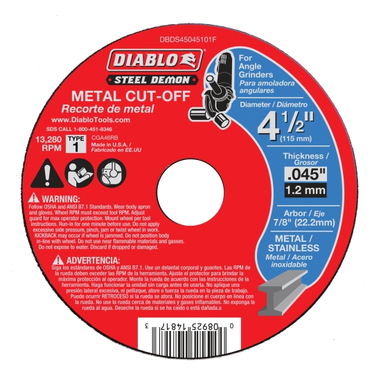 Steel Demon™ Type-1 Cut-Off Disc, 4-1/2 IN Width, 0.045 IN Thick, Steel, Additional Specifications: Arbor Size: 7/8 IN, RPM Rating: 13280 RPM, Abrasive Material: Ceramic