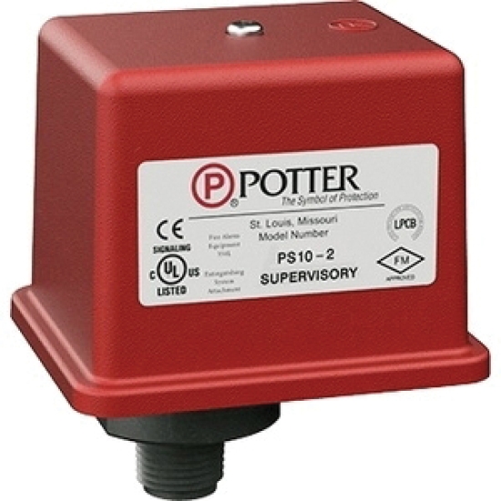 The Potter® PS10 Series pressure actuated switches are designed for the detection of a water flow condition in automatic fire sprinkler systems of particular designs such as wet pipe systems with alarm check valves, dry pipe, pre-action or deluge valves. The PS10 is also suitable to provide a low pressure supervisory signal, adjustable between 4 and 15 PSI.