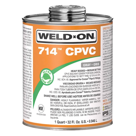 Weld-On® 714 Heavy Body Medium Set CPVC Cement, Additional Specifications: Viscosity: 1600 - 2400 CP, Shelf Life: 2 YR, Boiling Point: 56.05 DEG C, Gray, Can Container, -6.16 DEG F Flash Point, Liquid Form, Industry Standards: ASTM F493, D2846, Meets SCAQMD Rule 1168/316A, UL Listed, NSF Certified, GreenGuard Certified, LEED Compliant, Odor: Solvent, 1 QT, 0.978 Specific Gravity, Surface: Rigid CPVC, VOC: 393 G/L