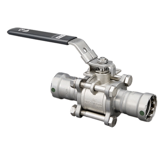 Viega MegaPress® 4875.8 3-Piece Ball Valve, 1/2 IN Nominal, Press X Press Connection, 250 PSI, 0 - 250 DEG F, 316 Stainless Steel Body, Locking Metal Handle Operator, 304 Stainless Steel Handle, 316 Stainless Steel Stem, RPTFE Seat, EPDM Seal, Industry Standards: ASME B31, MSS-SP110, IAPMO Z1157 Certified, Other Physical Dimension: 5.6 IN Inlet To Outlet Length, 2.85 IN Top To Inlet Center