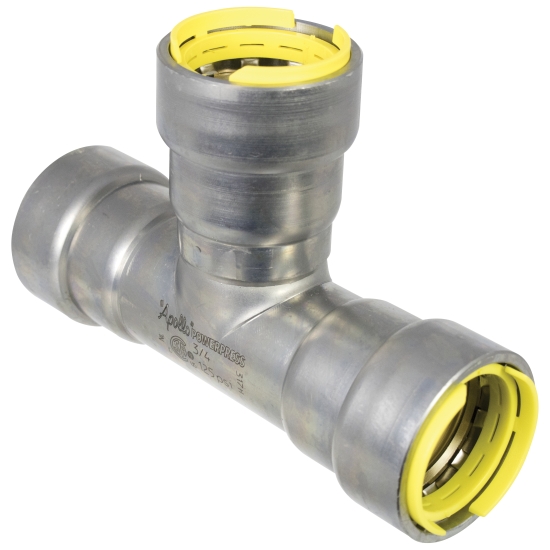 Apollo Valves PowerPress® 411G Tee, 1/2 IN Nominal, Press X Press X Press Connection, 0.11 IN Wall Thickness, Carbon Steel, Finish/Color: Gray/Zinc Nickel-Plated, 0.84 X 0.84 X 0.84 IN Outside Diameter, 4.1 IN Length, -40 - 194 DEG F, Industry Standards: CRN, CSA Certified, ICC Certified, IAPMO Certified, Additional Specifications: Includes: HNBR Sealing Elements, Buffer Stud, Capped and Connection Indicator