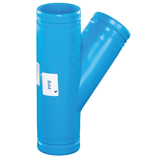 Blueline FRPP 45 DEG wyes are used in chemical waste drainage applications such as laboratories in schools, universities and research facilities. Blueline FRPP is molded from proxylene Blueline resin, a flame-retardant thermoplastic material with excellent resistance to most common and organic mineral acids and their salts, strong and weak alkalis and most organic chemicals. There are two methods for joining Blueline FRPP fittings and pipe. The No-Hub mechanical joint is an economical, fast and easy method that requires only standard hand tools. No-Hub uses a stainless steel outer coupling to create tight, leak-free and reconfigurable joints. The Rionfuse CF electrofusion joining system makes it easy-to-create strong joints that resist aggressive acids and chemicals. A heavy gauge wire is molded into the Rionfuse coupling and permanent hermetically sealed joints can be made quickly with the Rionfuser electrofusion machine.