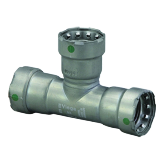 Viega Reducing Tee, 0 - 250 DEG F, Industry Standards: ABS Listed, ASME B31, CRN OA14541.6, CSA B149.1, DNV Certification, FM 1920, ICC LC1002, GL Listed, LR Certified, NFPA 13/13D/13R/31/54/58, UL 213, Carbon Steel, Sub Brand: MegaPress®, Item Name: Reducing Tee, Series/Model: Model 4818, Press X Press X Press Connection, 1-1/4 X 1-1/4 X 1 IN Nominal