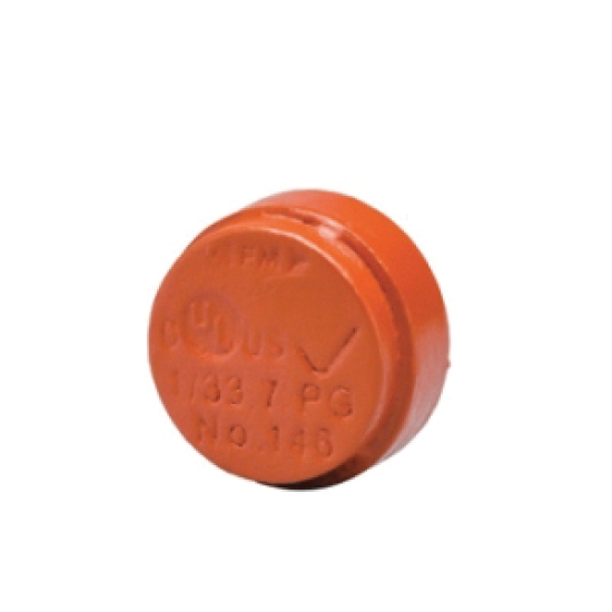 Victaulic Pipe Cap, Item Name: Pipe Cap, Series/Model: Model 146, 1 IN Nominal, 0.55 IN Wall Thickness, Ductile Iron, Material Standard: ASTM A536, Finish/Color: Orange Enamel Painted, 1.315 IN Outside Diameter, 365 PSI Maximum Pressure, Industry Standards: cULus Listed, FM Approved, LPCB, CE, UKCA, VdS
