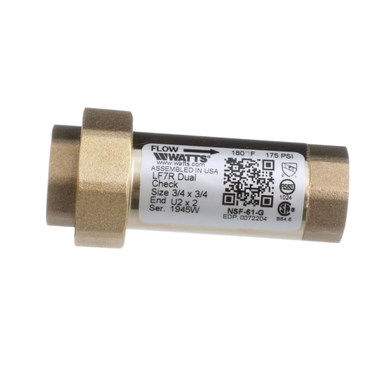 Watts Backflow Preventer Check Valve, Item Name: Backflow Preventer Check Valve, Series/Model: Series LF7R/Model LF7RU2-2 3/4 X 3/4, 3/4 X 3/4 IN Nominal, FNPT X FNPT Connection, 10 - 175 PSI, 33 - 180 DEG F, Brass Body, EPDM Seat, Industry Standards: ANSI/ASSE Standard 1024, Lead Free: Yes