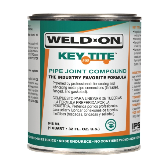 Weld-On® 505 Key-Tite™ is designed for sealing and lubricating metal pipe connections. This pipe sealant can be used on threaded, flanged and gasketed joints. It protects against rusting and seizing and creates a leak-free, pressure-tight joint that can withstand the demands of various metal piping systems. Can be used on metal piping systems carrying, diluted acid, air, alcohols, diluted alkalis, brine, dilutes caustics, acetylene, natural gas, low pressure steam lines, liquid sugar and hot or cold water. Do not use for propane, butane, oxygen, fluorine, liquid sodium systems or any manufactured gas. Always refer to lading guide for chemical compatibility before using the product.