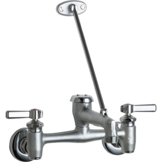 Service Sink Faucet, Manual Operation, 2 Handles, Handle Type: Lever, 1/2 IN Inlet Size, Connection Type: FNPT, Flow Rate: 12 GPM, 2 Holes, 8 IN Faucet Centers, Material: Cast Brass, Finish/Color: Rough Chrome Plated, Mounting: Wall, 7-7/8 IN Spout Reach, 4 IN Spout Total Height, 1-1/8 IN Spout Height Deck To Aerator, Flow Outlet Type: Ample, ADA Compliant: Yes, Industry Standards: ASME A112.18.1/CSA B125.1, ADA Compliant ANSI/ICC A117.1, Temperature Rating: 40 - 140 DEG F, Additional Specifications: Pressure Rating: 20 - 125 PSI