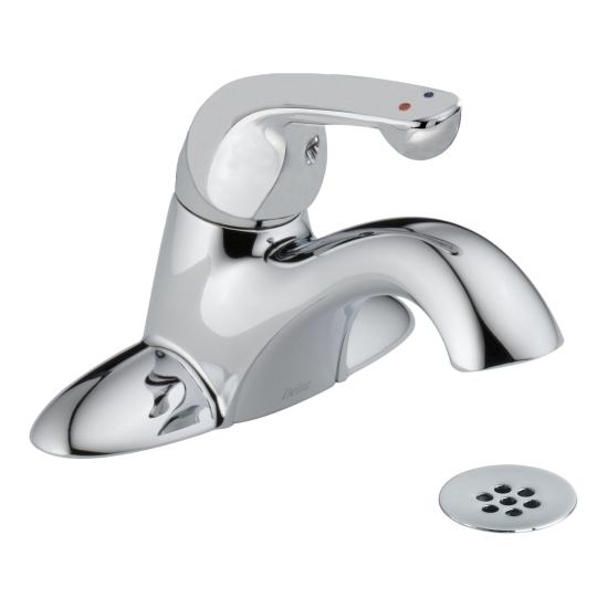 Centerset Lavatory Faucet, Manual Operation, 1 Handles, Handle Type: Lever, 3/8 IN Inlet Size, Flow Rate: 1.5 GPM At 60 PSI, 5.7 L/MIN At 414 KPA, 3 Holes, 4 IN Faucet Centers, Material: Solid Brass, Finish/Color: Chrome Plated, Metal Pop-Up Drain, Mounting: Deck, 5 IN Spout Reach, 6-9/16 IN Spout Total Height, 1-11/16 IN Spout Height Deck To Aerator, Valve Type: DIAMOND Seal®, Flow Outlet Type: Aerator, ADA Compliant: Yes, Industry Standards: CSA Certified, UPC Listed, ASME A112.18.1/CSA B125.1, ASME A112.18.2/CSA B125.2, ICC/ANSI A117.1, EPA WaterSense, Other Physical Dimension: 4-13/16 IN Height X 6-7/8 IN Depth X 6-17/32 IN Width